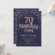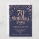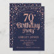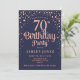 Convite de aniversário 70. Design elegante em azul marinho e ouro rosa brilhante. Possui fonte de script na moda e confetti. Envie-me uma mensagem se precisar de idade personalizada.