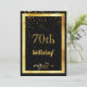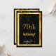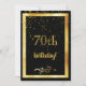 Um cartão de convite de aniversário festivo e elegante. Uma cor preta clássica de fundo e uma imagem falsa de ouro. Com um ouro de chuva confete. Na frente do texto: 70 aniversário! e uma decoração floral falsa de ouro. Traseira: Modelos para informações de sua festa, cartas de ouro.