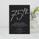 Este convite moderno da 75ª festa de aniversário apresenta um fundo preto chic com escrita branca e tipografia moderna. O roteiro diz "75º". Todas as cores (até mesmo o script do ano) são personalizáveis completa e facilmente. Você pode até adicionar uma foto atrás! Basta usar a "ferramenta design" no menu suspenso de personalização.