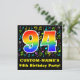 A frente desta design convite de aniversário divertida, vibrante e excitante apresenta um grande número "94" com um padrão inspirado no gradiente do espectro arco-íris, juntamente com um nome editável e a mensagem "94ª Festa de aniversário!" Parte do fundo tem um padrão divertido de várias notas e símbolos de música com várias cores e tamanhos. A parte traseira contém informações/detalhes personalizados relacionados ao evento para o qual os possíveis convidados estão sendo convidados. Cartões de convite para comemorações de aniversário divertidos e editáveis como este podem ser enviados a potenciais hóspedes de uma reunião comemorativa realizada para homenagear cantores, músicos, compositores de música ou noventa e quatro anos de alguém. [~Z0000427]