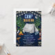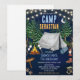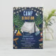 Vá para uma aventura épica de aniversário! Este convite de aniversário temático de acampamento apresenta um céu noturno naval mágico com lua crescente, luzes de corda brilhantes, árvores altas de pinheiro, uma tenda cinza clássica, fogueira crepitante com marshmallows torrados, lanterna, botas de caminhada, saco de dormir, pegadas de urso e uma placa de acampamento — a cena perfeita para uma celebração ao ar livre inesquecível.