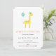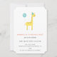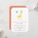 Uma girafa bonita, convite de aniversário. Girafa com chapéu de partido e balão azul, contrastando texto laranja e cor de apoio.