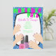 Comece sua celebração fora do direito com este convite de festas adorável do Manicure do spa/das meninas. Se é uma casa ou para fora meninas do partido apenas ame pampered em toda a idade. Isto convida tem dois grupos de mãos ambos com as unhas belamente lustradas. There'a duas garrafas do verniz para as unhas: rosa e roxo com brilho ou brilho nele perto da parte inferior do convite. A parte superior tem a rotulação brilhante soletrar para fora do "o partido Manicure" no verde limão e no rosa quente/roxo. O fundo é um olhar azul do brilho como. Verifique para fora os muitos outros produtos e projete-os nesta linha adorável. ilustrações do ©JW