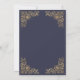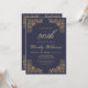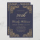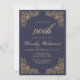 Este convite para bolsas mensageifestas de aniversario elegante apresenta uma imagem dourada antiga em quatro cantos. O número de aniversário editável e o nome do convidado de honra aparecem no script ouro do ornamentado, com o resto do texto personalizável na fonte da placa de impressão dourada em um fundo azul marinho escuro. O mesmo quadro dourado aparece no verso.