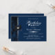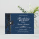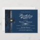 Um convite de aniversário preto e azul moderno com um arco de presente preto e azul com um embelezamento de diamante no topo do nó. Apresentado de forma elegante em texto branco. Os detalhes relevantes são facilmente trocados por suas informações para seu evento especial.