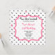 Um convite de aniversário com um fundo branco com bolinhas pretas pequenas na parte frontal e traseira. Quadros cor-de-rosa na frente e atrás. Personalize o texto na frente com detalhes do evento. Recursos do verso ilustram o cupcake rosa e branco.