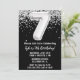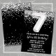 Convite de aniversário preto e branco com convite de aniversário de idade 7 com brilho e moderno e escrevendo de escrita e balões de folha divertida.