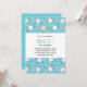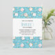 Convite de festa de aniversário com um padrão de gato fofo, definido em um fundo azul e decorado com arco-íris e pegadas de patas e muito mais.