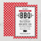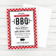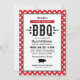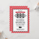Convite de aniversário casual com tema churrasco / barbecue apresenta um motivo de porco, texto preto personalizado elegante em fontes western e modernas, estrelas, e um design de borda xadrez com toalha de mesa gingham vermelha.
