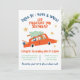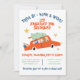 Festa de Aniversário de Natal. Caracteriza um carro laranja retrô com passageiros de rena e pinguim. O carro carrega uma árvore de natal e presentes no caminhão, cercado por estrelas. Toda a redação pode ser alterada. Ótimo para menino ou menina!