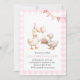 Celebre o dia especial do seu pequeno com este convite de aniversário adorável. Apresentando dois patos-d'água doces, um bolo de aniversário, um balão cor-de-rosa e uma bela borda de gingham, esta design é perfeita para uma comemoração de um animal fazenda ou de um tema pastel. Personalize com o nome do seu filho, os detalhes da festa e as informações de RSVP. Ideal para aniversários de criança, aniversários de primeiro ano ou qualquer festa de primavera/verão com estilo suave e caprichoso. Impresso em estoque de cartão de alta qualidade e totalmente personalizável para se adequar ao seu evento.