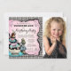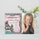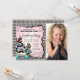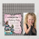 Convite de festa de aniversário da Alice no País das Maravilhas com xícaras de chá bonitas em um fundo de diamantes rosa e preto vintage e espaço para foto. Este convite de festa de aniversário com foto do País das Maravilhas é facilmente personalizado para o seu evento, basta adicionar seus detalhes no estilo de letra, cor e texto de sua escolha. Este é um design impresso sem brilho real, etc.