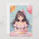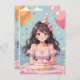 Menina de anime rosa bonito e teal com bolo de aniversário e balões com convites de aniversário temáticos. Fundo floral azul, rosa.