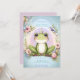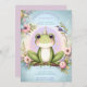 A carta apresenta uma ilustração encantadora de uma princesa sapo sorridente adornada com uma pequena coroa, sentada contente num tronco em meio a um jardim de fantasia. Um arco-íris pastel lança um brilho suave atrás dela, somando-se à atmosfera caprichosa. Flores cor-de-rosa macio e azuis, juntamente com criaturas amigáveis do jardim, criam uma cena serena e convidativa. Essa design encantadora é perfeita para a festa de aniversário de uma criança com um conto de fadas ou tema da princesa.