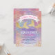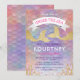Convites de aniversário mágicos e femininos com um fundo colorido pastel da cauda de sereia, brilho dourado e rosa, algas, duas caudas de sereia com brilho dourado e um modelo moderno de festa de aniversário infantil que é fácil de personalizar.