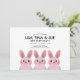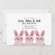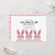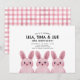 Tema de coelhinho fofo para convite de festa de aniversário das Melhores Amigas ou trigêmeos, apresentando três coelhinhos bebês rosa. Parte de trás com padrão xadrez.