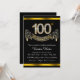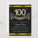 Convite de aniversário de 100 anos com números de diamante e faixa em um belo e rico fundo preto e dourado. Este convite de aniversário de 100 anos preto e dourado é facilmente personalizado para o seu evento. Você pode alterar a cor do fundo. Este design impressionante funciona bem para homem ou mulher. Este é um design impresso sem diamantes reais, prata, glitter, etc.