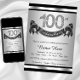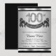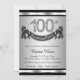 Convite de festa de aniversário de 100 anos de prata com números de diamante e faixa de feliz aniversário em um fundo preto e prata. Este convite de festa de aniversário de 100 anos é facilmente personalizado para o seu evento. Você pode alterar a cor do fundo. Este design impressionante funciona bem para homem ou mulher. Este é um design impresso sem diamantes, prata, glitter, etc. reais.