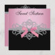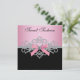 Convite de festa de aniversário de 16 anos elegante com laço rosa e preto e diamantes brancos. Este convite de festa de aniversário rosa e preto é facilmente personalizado para o seu evento adicionando detalhes do evento, estilo de fonte, tamanho e cor da fonte e texto.