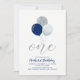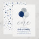 Celebre um dia especial para o seu querido com este convite de aniversário de 1 ano fofo! Este design apresenta uma tipografia elegante "Um" com balões e confetes em uma combinação de cores azul marinho, cinza e prata. Combine o seu convite com as decorações da festa de aniversário. Convite perfeito para uma festa de primeiro aniversário moderna para uma menina. Se você precisar de uma cor ou design personalizado, entre em contato comigo por e-mail (barabomdesign@gmail.com).