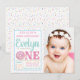 Convites de festa de aniversário de um ano com donut rosa e fundo de confeitos para foto. Este convite de festa de aniversário de donut é facilmente personalizado para o seu evento, adicionando sua foto e detalhes.