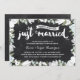 Este convite de aniversário de 20 anos de casamento, elegantemente casual, apresenta linda caligrafia, lindas flores azuis e brancas, tipografia que diz "Casados (há vinte anos!)", e um fundo rústico de quadro-negro.