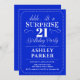 Convite de festas de aniversário de 21 anos surpresa. Design de classe simples em azul e branco reais. Apresentando uma fonte elegante de script. Celebração surpresa para homem ou mulher. Pode ser personalizado em qualquer idade!