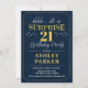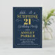 Convite de festa de aniversário de 21 anos surpresa. Design simples e sofisticado em azul navy e dourado. Com uma fonte de letra elegante. Celebração de aniversário surpresa para homem ou mulher. Pode ser personalizado para qualquer idade!