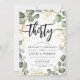 Convite de festas aniversário de 30 anos. Design floral elegante em branco verde e ouro brilhante. Design clássico moderno com cores aquáticas pintadas manualmente, verduras e roteiros de eucalipto eucalipto. Perfeito para uma comemoração de na moda 30 dias. Personalize com seus próprios detalhes. Pode ser personalizado para qualquer idade! Impressos convites Zazzle ou modelo de impressão digital instantânea para download.