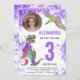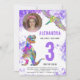 Dinossauras aniversário de 3 anos convite de festas com modelo de foto. Púrpura cor d'água e colorida T-Rex e pterodactyl dino para comemorar seu pequeno T-Rex girando três, ideal para as meninas que amam dinossauros. Tyrannosaurus rex e pterodactyl multicolores em cores vibrantes cor azul roxa e verde-lacrimejante. Modelos fáceis de usar para personalizar com uma foto, o número do aniversário e os detalhes da festa e você está preparado para uma divertida e cheia de dinossauros Jurássicos, tema dino terceira festa de aniversário. Todas as espécies de dinossauros são bem-vindas. Arte original da artista Catherine Sweetman