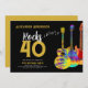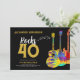 música de guitarra, aniversário de 40 anos moderno, convite a preto e ouro com guitarras psicodélicas e notas musicais. Ilustração detalhada de uma guitarra elétrica com padrão de chama Fire e guarda vermelha de picada, uma guitarra semiacústica multicolorida e uma arte de guitarra acústica clássica psicodélica. Fácil de personalizar a tipografia do ouro na tipografia legal moderna. Crie um convite de festas personalizado de aniversário de 40 anos rock and roll para celebrar quarenta no estilo rock n roll ideal para um guitarrista, músico e amante da música. Qualquer guitarrista lhe dirá que você nunca pode ter muitas guitarras. Este legal instrumento musical moderno design comemora a energia musical deste maravilhoso instrumento musical e é a forma perfeita de celebrar o quadragésimo aniversário. Arte original da artista Catherine Sweetman