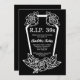 Rip 30s convite de aniversário para comemorar o aniversário de 40 anos de uma mulher. Design preto com letras brancas, um caixão, rosas e as palavras "morte da juventude". Personalize-o com os detalhes do seu partido e as informações de RSVP.