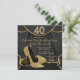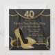 Convites de festa de aniversário de 40 anos para mulheres com sapatos de salto alto glitter preto e dourado com belos sapatos de salto alto glitter dourado em um fundo de cortina preto e dourado. Este convite de aniversário de 40 anos preto e dourado é facilmente personalizado para a sua festa ou evento, adicionando detalhes do evento, estilo de fonte, tamanho e cor da fonte e texto.