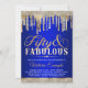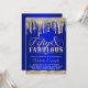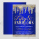 Convite de festa de aniversário de cinquenta anos fabuloso azul real e dourado com diamante elegante e gotas douradas em um fundo azul real bonito. Este convite de festa de aniversário de 50 anos de diamante azul e dourado para mulheres é facilmente personalizado para o seu evento, basta adicionar seus detalhes no estilo de fonte, cor e texto de sua escolha.