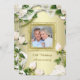Convite de festa de aniversário de 50 anos de casamento dourado com belas rosas brancas, diamantes, fitas de pérolas e moldura de foto com redemoinho dourado elegante. Este convite de festa de aniversário de 50 anos de casamento dourado é facilmente personalizado para o seu evento, adicionando sua foto e detalhes do evento, no estilo de fonte e cor, e redação de sua escolha. Este é um design impresso sem jóias reais, fitas, brilho, etc.