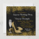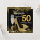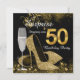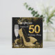 Convite surpresa de festa de aniversário de 50 anos em preto e dourado com taça de champanhe elegante e sapatos de salto alto dourados. Você pode personalizar facilmente este convite de festa de aniversário de 50 anos em preto e dourado para o seu evento, simplesmente adicionando seus detalhes no estilo de fonte e cor, e texto de sua escolha.