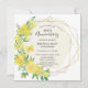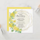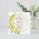 Perfeito convite de aniversário de casamento de 50 anos para a primavera ou verão. Rosas amarelas e flores de mimosa decoram uma moldura geométrica elegante dourada. Todo o texto pode ser editado.
