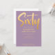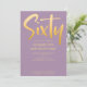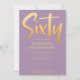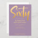 Introduza um novo convite de aniversário de 60 anos moderno e elegante, fundo violeta com texto de tipografia manuscrita em cor dourada "sessenta". Personalize este cartão modelo adicionando suas próprias informações de festa.