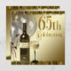 Convite de festa de aniversário de 65 anos com balões e garrafa de vinho com taça dourada.