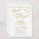 Design Elegante de Convite de aniversário surpreendido com ouro brilhante e branco. Possui fonte de script e confetti. Saúde para 70 anos! Me mande mensagem se precisar de uma idade personalizada.