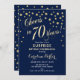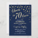 Convite de aniversário Elegante 70 surpreendido com ouro brilhante falso e azul marinho. Possui fonte de script e confetti. Saúde para 70 anos! Me mande mensagem se precisar de uma idade personalizada.
