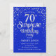 Convite de aniversário de 70 surpresa. Design elegante em azul real e prata brilhante falso. Possui fonte de script na moda e confetti. Envie-me uma mensagem se precisar de idade personalizada.