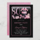 Design de aniversário de "80", cor-de-rosa e preta, inspirado em couture francesa, apresentando um bolo de chapéu, estilettos cor-de-rosa e uma mala de maquiagem entre vários presentes de aniversário e cupcakes lúcidos. Perfeito para comemorar ocasiões de aniversário. A idade é criada em uma fonte ineditável cor-de-rosa-claro. Por favor, designer de mensagens se você precisar desta modificação para uma idade diferente da oferecida em nossa coleção.