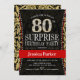 Convite de aniversário de 80 de surpresa para mulheres ou homens. Design elegante em ouro brilhante, preto e vermelho. Possui fonte de script e número de diamante. Perfeito para uma festa de surpresa para adultos na moda.