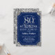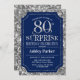 Convite à Celebração de Aniversário de 80 Surpresa. Design elegante em azul marinho e padrão de prata brilhante. Apresenta uma fonte elegante de script. Envie-me uma mensagem se precisar de mais personalização.