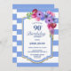 Convite para festa de aniversário de 90 anos com listras azuis florais.