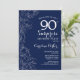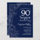 Convite de aniversário 90 azul-marinho e branco-surpresa. Design minimalista moderno com sotaques botânicos e letra de escrita tipográfica. Simples cartão de convite floral perfeito para uma festa surpresa na moda. Pode ser personalizado para qualquer idade. Impressos convites Zazzle ou modelo de impressão digital instantânea para download.