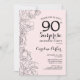 Convite de aniversário de 90 de surpresa floral rosa e preto. Elegante design moderno com sotaques botânicos e letra de script de tipografia. Simples cartão de convite floral perfeito para uma festa surpresa na moda. Pode ser personalizado para qualquer idade. Impressos convites Zazzle ou modelo de impressão digital instantânea para download.