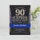 Convite de aniversário de 90 de surpresa para mulheres ou homens. Design elegante em ouro brilhante, preto e azul real. Possui fonte de script e número de diamante. Perfeito para uma festa surpresa de na moda.