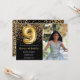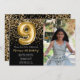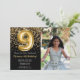 Convite de aniversário de 9 anos elegante preto e dourado para uma menina de 9 anos com escrita elegante em design de fonte dourada e balões de folha divertidos.